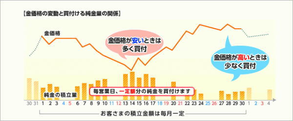 保管方法が消費寄託の場合なら費用が少ない傾向にあるようです。ちなみに金地金や地金型金貨の投資ならこの費用はありません。純金積立ならではの費用ということで、純金積立は基本的に長期的な運用をすることが前提の投資なので、積み立てる会社はしっかり検討したいところです。